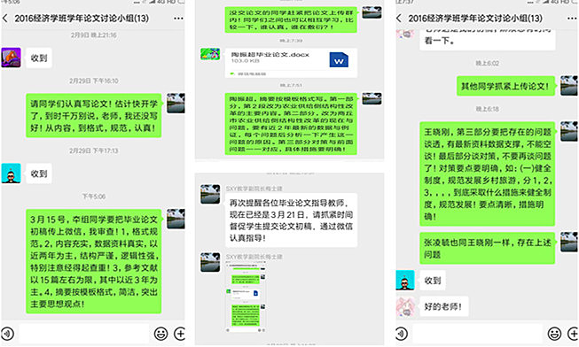 疫情考验责任心,教师们的认真、耐心、细致的指导赢得学生的敬佩与点赞。2016经济学王晓刚同学说:梅老师在微信上不厌其烦的指导我开题,反复讨论论文框架,为我提供最新的参考文献,让我为梅老师的敬业精神深深感动。我决心认真写好毕业论文,不辜负老师希望。目前论文初稿已经写好。2016市场营销吴婷同学说:芬姐(徐志芬)将我们的论文和疫情相结合,指导我们找出疫情对企业营销的影响,一方面保证了论文选题的新颖,写作内容的与时俱进,另一方面又从实践角度加深了我们对疫情影响的理解,拓宽了我们的写作思路,犹如醍醐灌顶。