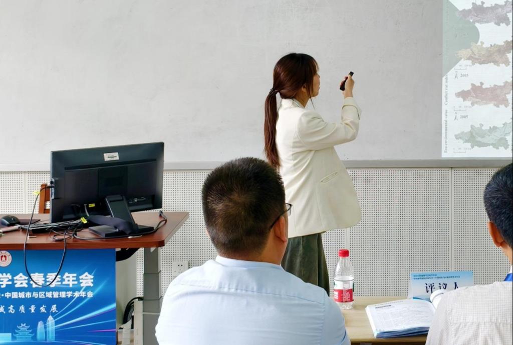 在第75分论坛“智慧土地管理与区域高质量发展”中,我院理论经济学专业研究生李欣雨同学作了题为《基于生态环境质量时间的半干旱区“生产-生活-生态”空间冲突识别、预测与优化——以关中平原城市群为例》的学术报告。报告以“生态环境质量”为切入点,运用空间分析与情景模拟方法,系统探讨了半干旱地区空间冲突特征及其演变趋势,并提出了具有针对性的优化路径。研究成果聚焦区域可持续发展,兼具理论深度与现实指导意义,受到与会专家和同行的积极评价与广泛关注。