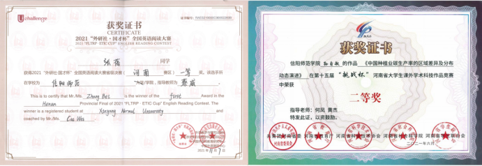 2021年,会计学专业研究生张蓓荣获2021“外研社国才杯”全国英语阅读大赛河南省一等奖;孙自敏在第十五届“挑战杯”河南省大学生课外学术科技作品竞赛中荣获二等奖;肖延玉、金华丽、刘琳、汪道峰等在第十五届“挑战杯”河南省大学生课外学术科技作品竞赛中荣获三等奖;李剑岚、王静瑶等荣获第八届河南省大学生物流仿真设计大赛三等奖;董梦梦、张美辰等荣获第七届大学生职业生涯规划大赛三等奖。