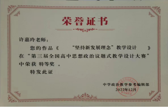 经过激烈的角逐,2022年12月,由陕西师范大学出版总社中学政治教学参考编辑部主办的第三届全国高中思想政治议题式教学设计大赛落下帷幕。ok138cn太阳集团5292022级学科教学(思政)专业硕士研究生许嘉玲在指导教师方晓波副教授的指导下斩获特等奖。
