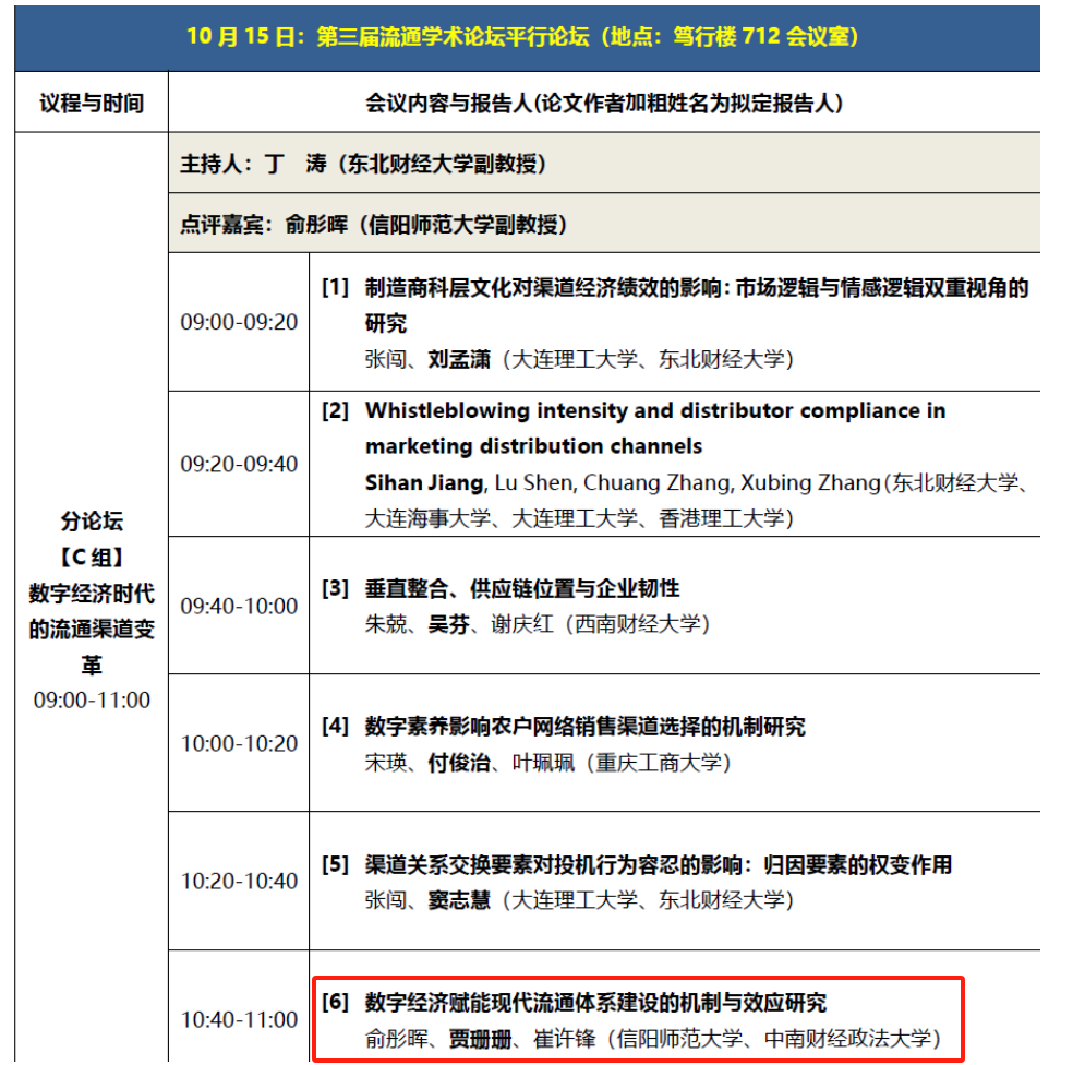2023年10月14日至15日,由东北财经大学流通研究院主办、商务部流通业发展司指导的第四届流通发展论坛暨第三届流通学术论坛如期在辽宁省大连市东北财经大学举行,本届论坛以“流通的数字化与可持续发展”为主题,分为主旨演讲、优秀论文报告与点评、主题报告、期刊编辑面对面、博士(硕士)研究生平行论坛五个环节。此次流通发展论坛的征文内容涵盖了流通高质量发展、流通数字化转型、流通领域的可持续性发展与流通创新等方面的前沿问题。我院研究生踊跃向会议投稿,其中,理论经济学专业硕士研究生贾珊珊的学术论文入选会议并受邀进行学术汇报,其撰写的论文题目为《数字经济赋能现代流通体系建设的机制与效应研究》。该研究生的论文汇报得到了现场点评嘉宾的高度评价。