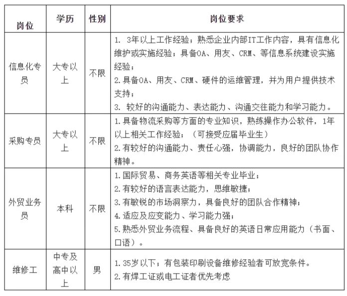 1.大专及以上学历,印刷工程或包装工程等相关专业毕业;