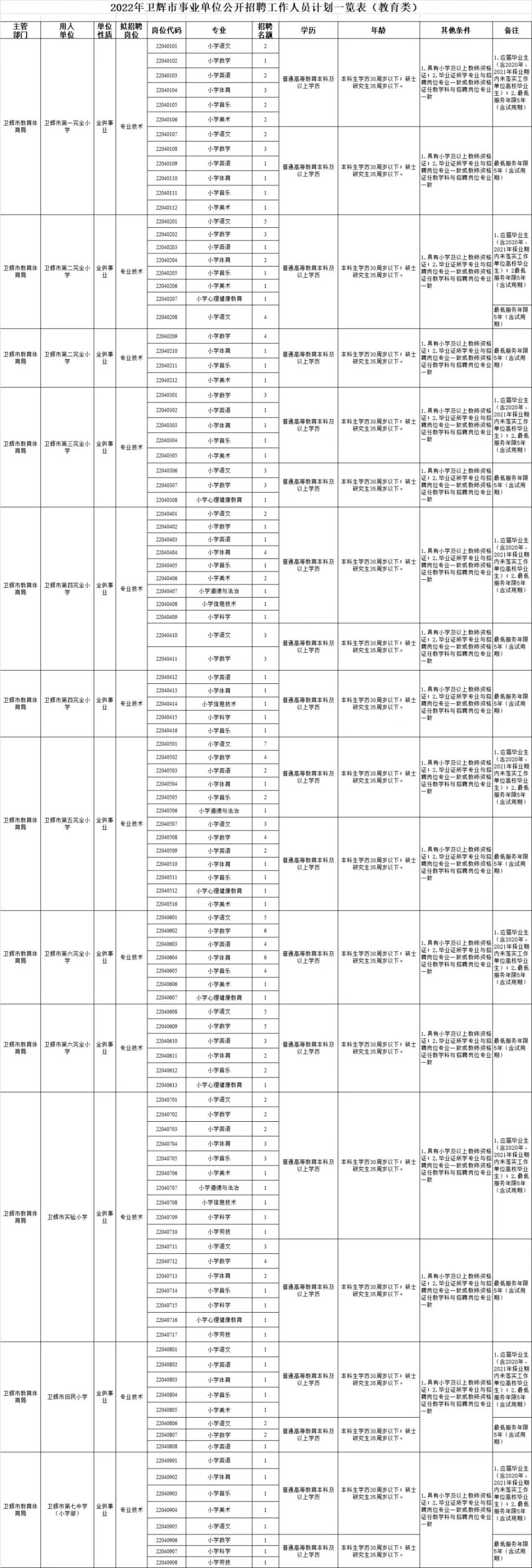 本次事业单位共计划招聘732人,其中市直11人、乡镇200人(含限制专业87人、不限制专业113人),教体系统450人(含高中教师40人、义务教育阶段教师405人、特殊教育学校教师5人),卫健系统71人(含事业全供25人、事业差供46人)。具体招聘计划及相关内容见《2022年卫辉市事业单位公开招聘工作人员计划一览表》(附件1)。