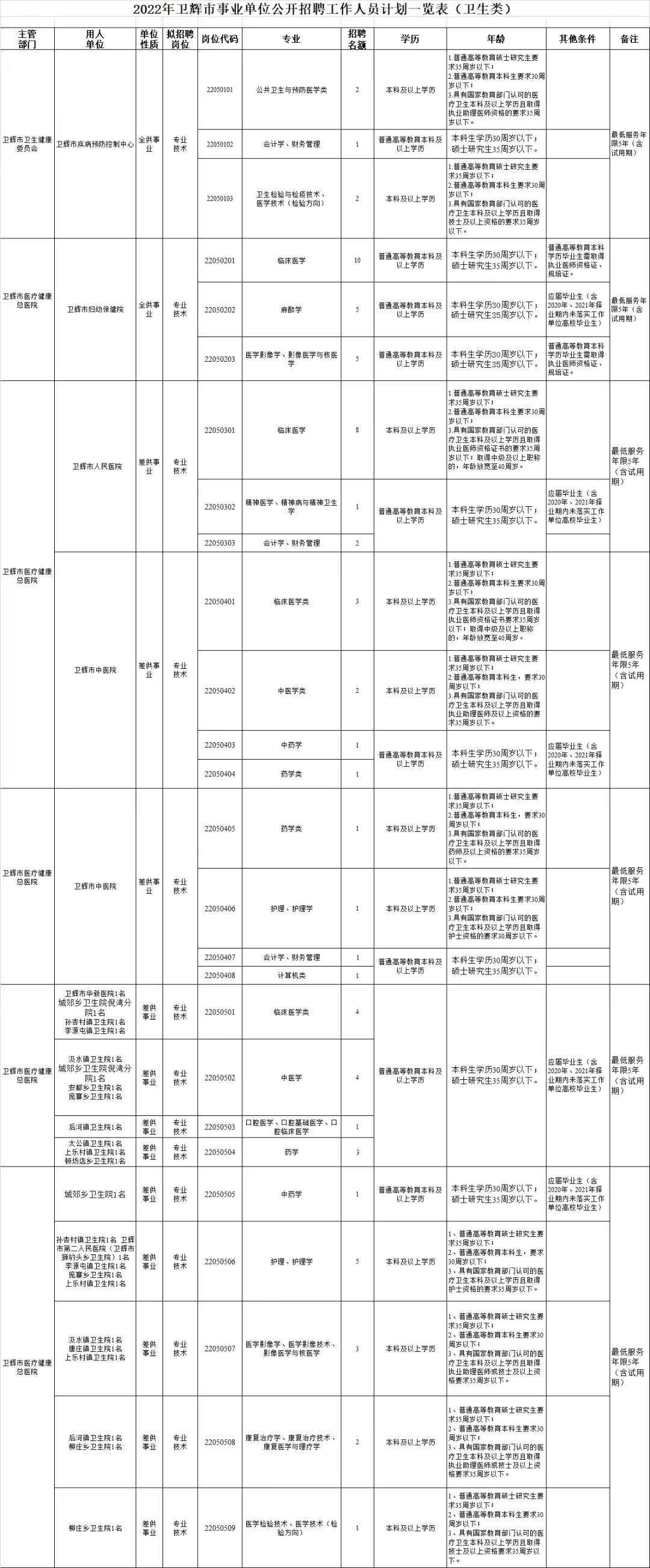 附件1:2022年卫辉市事业单位公开招聘工作人员计划一览表