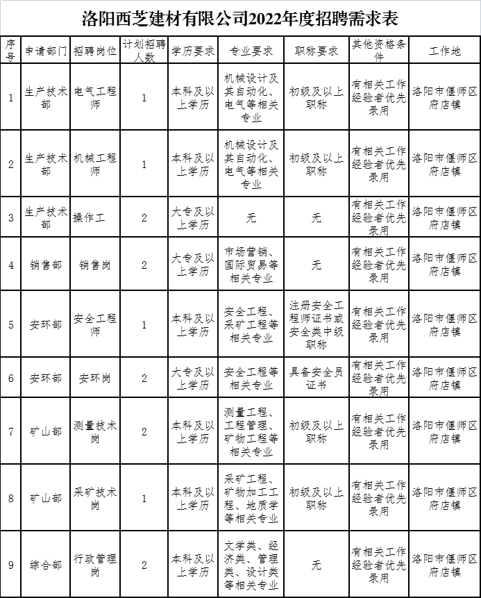 西芝公司计划招聘合同制员工14人。岗位明细、任职要求及岗位职责详见附件《洛阳西芝建材有限公司2022年度招聘需求表》(附件1)。