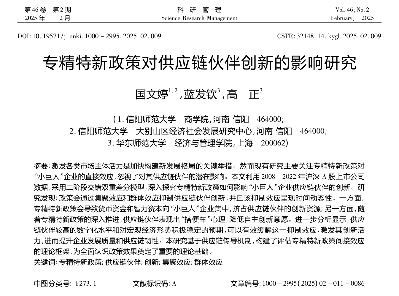 近日,ok138cn太阳集团529国文婷博士在管理学权威期刊《科研管理》2025年第2期上发表题为“专精特新政策对供应链伙伴创新的影响研究”学术论文。《科研管理》为国家自然科学基金委员会管理科学部认定的管理科学A级重要期刊,被五大检索库(CSSCI,北大核心,JST,CSCD,AMI核心)同时收录,为我校认定的一级权威期刊。