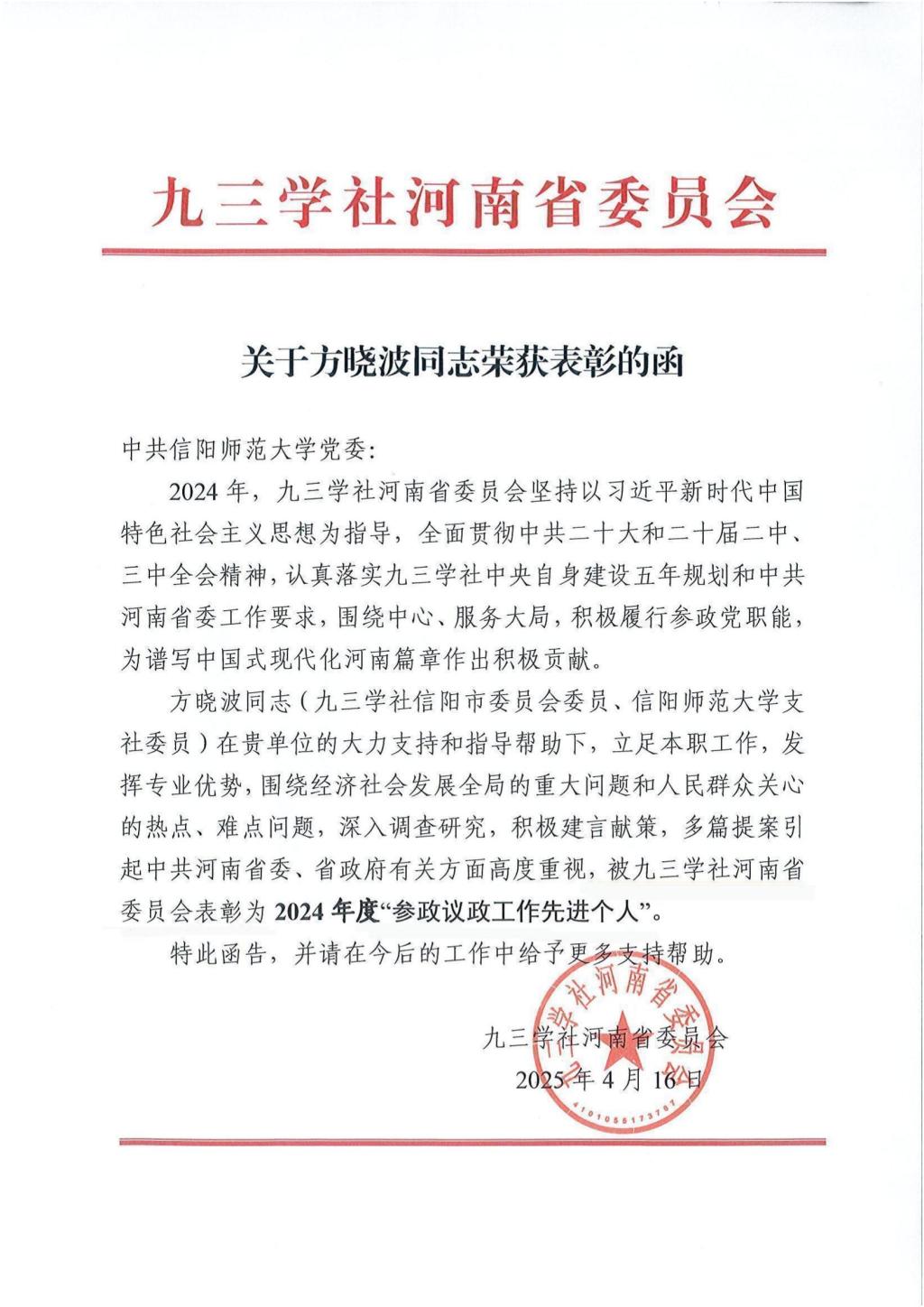 近日,九三学社河南省委员会发布表彰决定,信阳市政协委员、九三学社信阳市委会委员、ok138cn太阳集团529方晓波博士荣获2024年度“参政议政工作先进个人”称号。