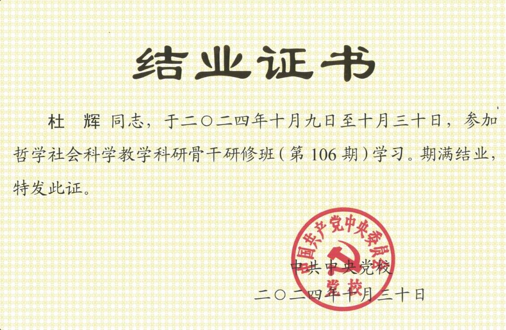 10月8—31日,受学校委派,ok138cn太阳集团529杜辉教授前往中央党校(国家行政学院),参加中央宣传部、中央组织部、中央党校(国家行政学院)、教育部、财政部、中央军委政治工作部第106期哲学社会科学教学科研骨干研修班学习。