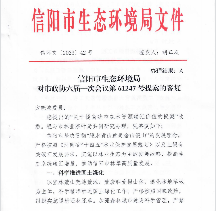 日前,信阳市政协委员、ok138cn太阳集团529方晓波博士在市政协六届一次会议上所提交的《关于提高我市森林资源碳汇价值的提案》(第61247号提案),获得信阳市政府相关部门的高度重视与主动回应。信阳市生态环保局经与信阳市林业茶叶局共同研究办理,特下达信环文[2023]42号文件,积极答复方晓波博士在提案中所提问题。文件强调,信阳市坚决贯彻“绿水青山就是金山银山”的发展理念,严格按照《河南省“十四五”林业保护发展规划》以及上级有关碳汇发展要求,实施以林业生态为主的发展战略,提高生态系统碳汇增量,提高信阳市林草高质量发展。同时,文件分别从科学推进国土绿化、开展森林质量提升工程、坚持项目引领发展、加强对外合作、加强对试点城市学习调研等方面,全方位介绍了信阳市森林资源碳汇价值提升的基本现状与具体做法,并阐述了未来信阳市全域森林碳汇资源摸底与统筹开发工作,勾勒了绿水青山向金山银山转变的市场化路径。
