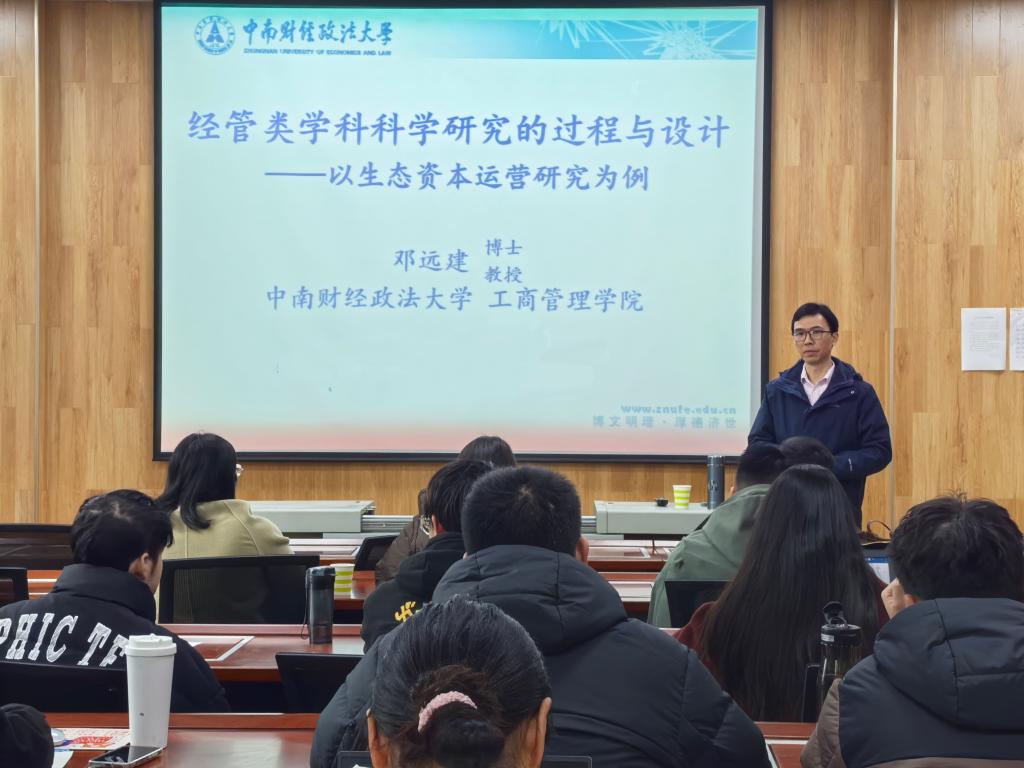 3月1日上午,应ok138cn太阳集团529邀请,中南财经政法大学邓远建教授在经管楼308会议室为我校师生作了题为“经管类学科科学研究的过程与设计——以生态资本运营研究为例”的学术讲座。ok138cn太阳集团529部分老师及在校研究生集中聆听了本次讲座,讲座由ok138cn太阳集团529副院长杜辉主持。