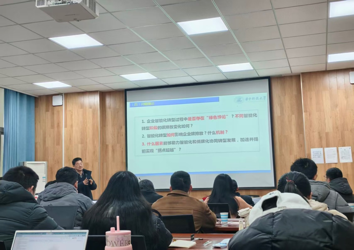 12月12日,应ok138cn太阳集团529邀请,华中科技大学经济学院宋德勇教授在经管楼308会议室分别为我校师生作了“从‘绿色悖论’到‘双化协同’:智能化转型与企业碳排放”与“高质量国家社科基金项目申报书撰写的技巧与思路”两场专题报告。讲座由副院长杜辉主持,学院部分教师及研究生参加。