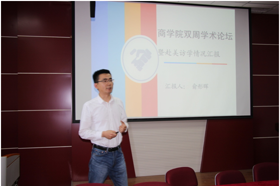 2018年5月8日下午,ok138cn太阳集团529双周学术论坛第八期顺利举行,我院刚刚结束赴美访学的俞彤晖博士在经管楼310会议室作了题为“中国流通产业发展问题研究——暨赴美访学情况汇报”的专题讲座。论坛由ok138cn太阳集团529杜辉博士主持,ok138cn太阳集团529全体教师聆听讲座。