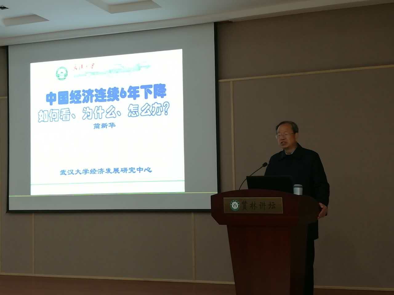 简新华教授从中国经济走势的思路之争、经济发展态势判断、经济下行主要原因、保增长的主要对策四个方面对中国经济当前的整体形势及走势进行了全面解读。最后,简教授针对中国经济的下行主因,详细指出有效的应对之策,并认真回答了师生们所提出问题。