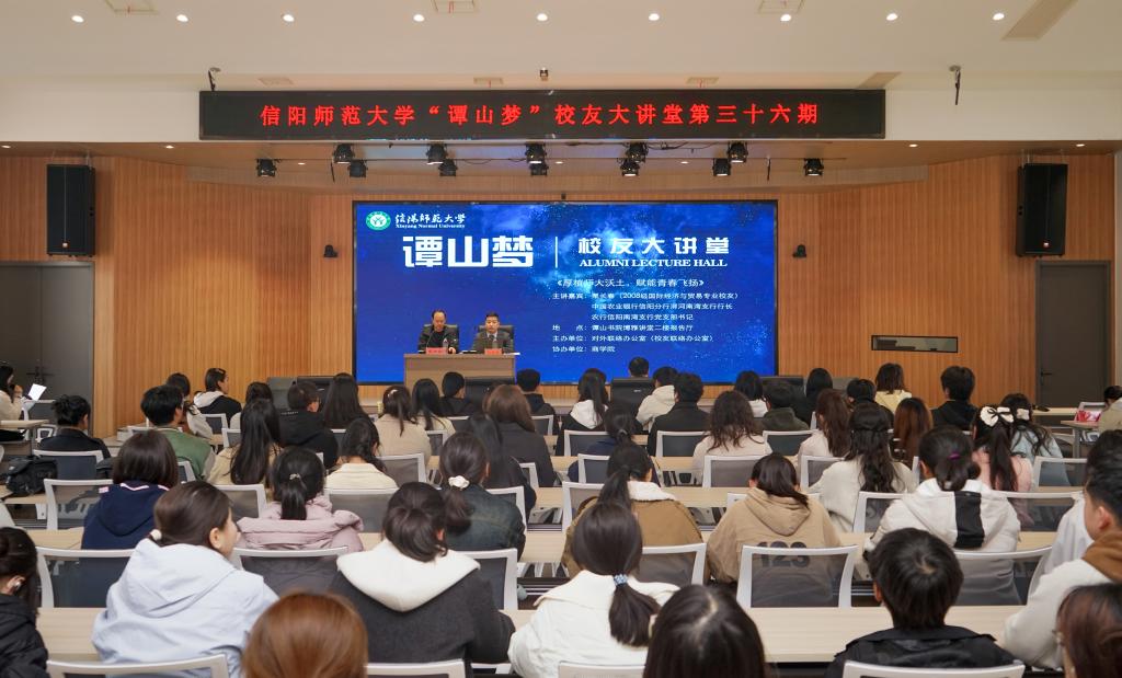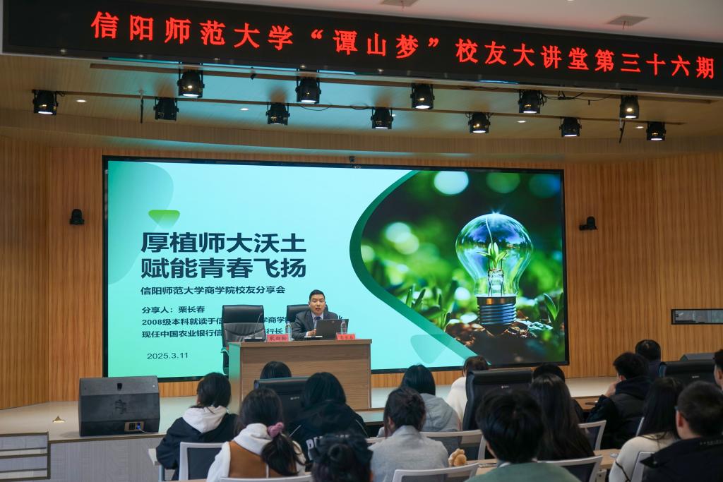 3月11日,ok138cn太阳集团529于博雅讲堂举办校友经验分享会。我院国际经济与贸易专业校友、中国农业银行信阳分行南湾支行行长兼党支部书记栗长春以《厚植师大沃土,赋能青春飞扬》为主题,与200余名师生分享求学心得感悟。ok138cn太阳集团529副院长梁静波参加分享会,会议由对外联络办公室主任耿劲松主持。