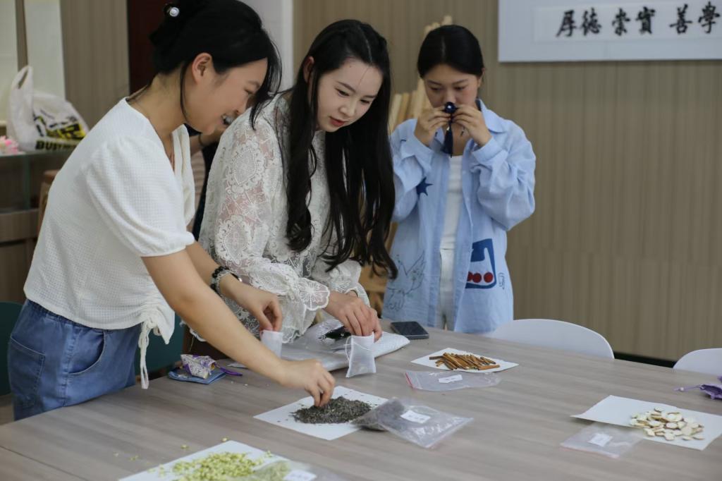活动现场,工作人员提前备齐了丰富的制作材料:长案上铺陈着各色绸缎、丝线、流苏配件,青瓷盏中艾叶、丁香、藿香等香草散发着清芬。在专业示范指导下,参与师生按照裁剪布料、缝制袋口、填充香料、装饰流苏的步骤,专注制作每一个香囊,指尖穿梭间,绸缎与香草的气息交织成端午特有的文化韵律。最后,黄钰莹代表学院向学生赠送粽子等礼物,用传统美食传达端午安康的诚挚祝福。
