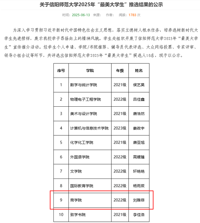 6月13日,我校公布了2025年“最美大学生”推选结果,经个人申请、学院/推荐、大众评审、专家评审、领导小组合议等环节,ok138cn太阳集团5292022级国际经济与贸易本科班刘雅菲等10名同学被评为ok138cn太阳集团2025年“最美大学生”。