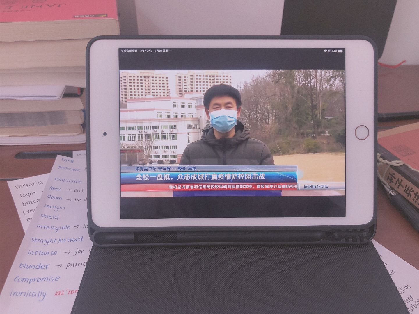 在这个特殊的时期,我们用不一样的方式展开了新学期的第一课,疫情挡住了我们返校的路途,却挡不住我们学习的脚步。云课堂拉近了我们的距离,学生虽身在五湖四海,心却连在一起,一起在家聆听宋书记、李校长的教导,聆听各大学专家关于疫情防控的知识讲解,一起通过网络汲取专业知识,也共同为武汉祈福。中国加油!武汉加油!(供稿人:徐志芬)