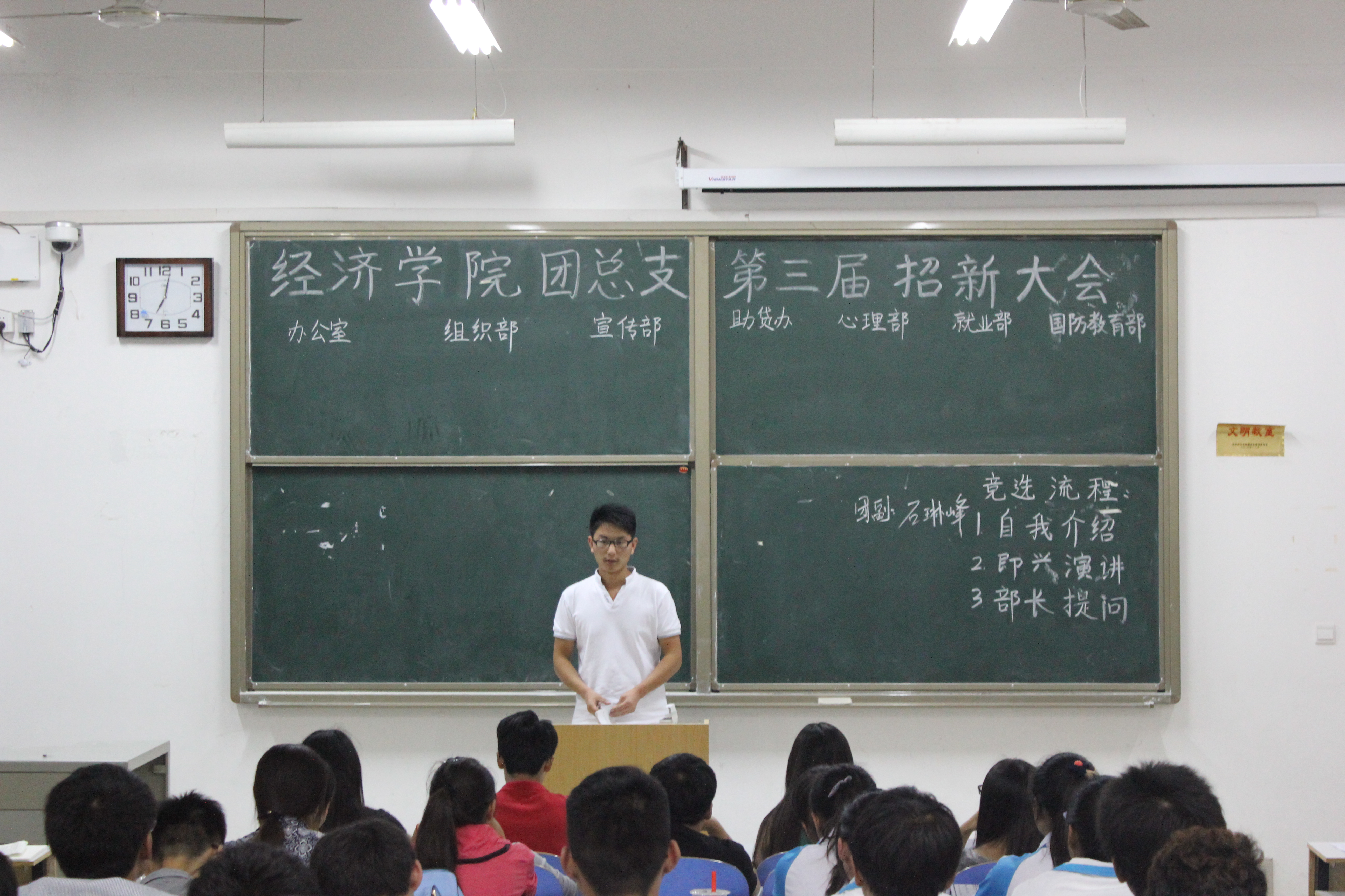 传递优良作风,注入新生活力,9月21日晚七点在经管楼101教室举行了“经济学院团总支第三届招新大会”。团总支副书记石琳峰及各部部长、副部长出席会议,竞选新生参加会议。会议由办公室负责人韩凯伦主持。