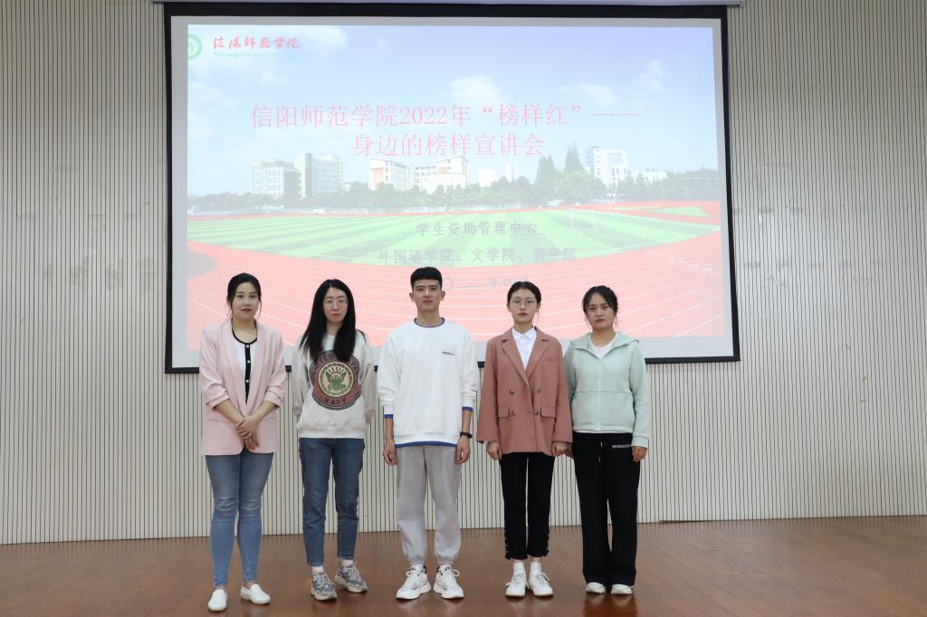 为充分发挥青年榜样的先进典型导向作用,激励青年学生珍惜韶华,不懈奋斗,4月29日下午,“‘榜样红’——身边的榜样宣讲会”在人文楼报告厅举办。ok138cn太阳集团529杨紫涵、文学院许霏、外国语学院孔宪巍等老师和三个学院的学生代表参加了宣讲会。大学生国家奖学金获得者任旭、校园明星程晓龙、自强之星王金艺受邀进行宣讲。
