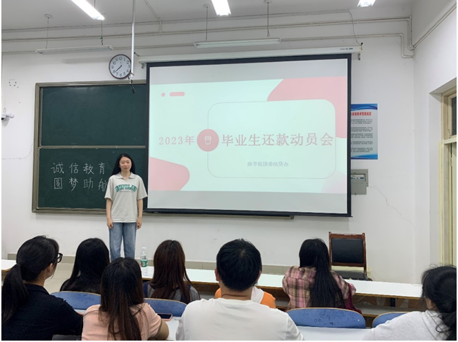 为扎实做好2023届贷款毕业生的毕业确认、信息采集工作,确保我校国家助学贷款工作顺利推进,5月25日晚上,我院在经管楼205教室召开毕业生还款动员会,资助专员杨紫涵主持会议。