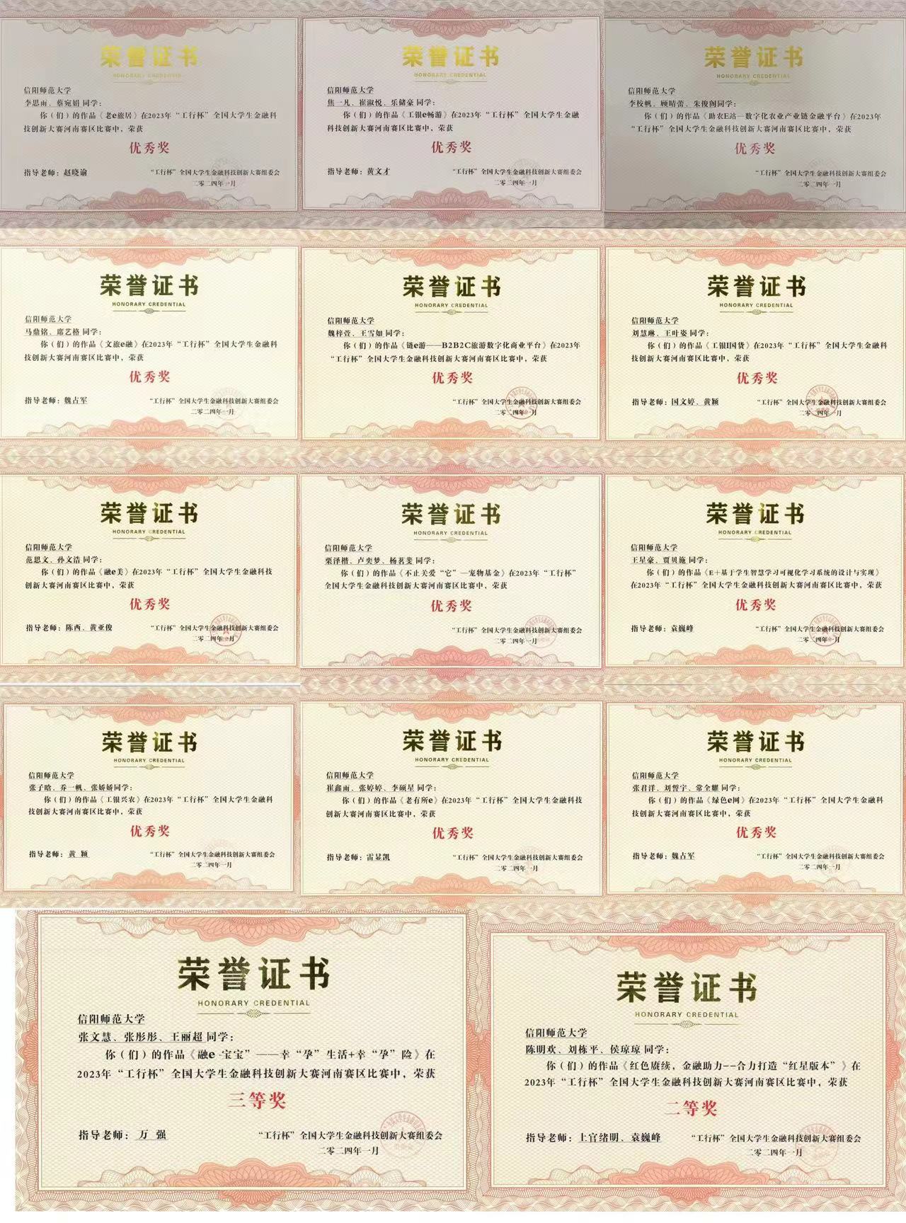 近日,由中国工商银行主办的“工行杯”全国大学生金融科技创新大赛圆满落幕。我校ok138cn太阳集团529选派学生参加比赛,经过激烈角逐,再创佳绩,共获全国区域赛百强奖1项,省二等奖1项,省三等奖1项,省优秀奖12项。其中,ok138cn太阳集团529夏金梅、张海霞老师指导,刘雨梦、李心雨、张欣慧完成的作品荣获全国区域赛百强奖;ok138cn太阳集团529上官绪明、黄亚俊老师指导,陈明欢、刘栋平、侯琼琼完成的作品荣获省赛二等奖;ok138cn太阳集团529万强老师指导,张文慧、王丽超、张彤彤完成的作品荣获省赛三等奖。
