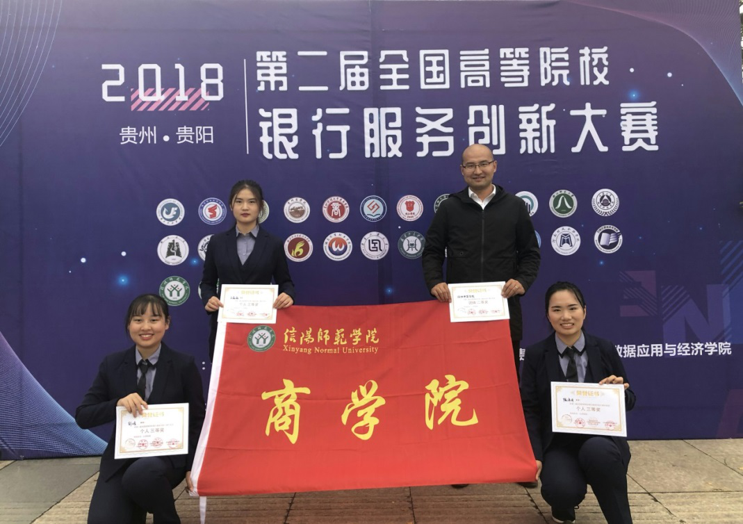 2018年10月27号,第二届全国高等院校银行服务创新大赛在贵州财经大学举办,我院学生彭靖、陈泳月、王晶晶均获得个人三等奖,我院代表队荣获团体二等奖。
