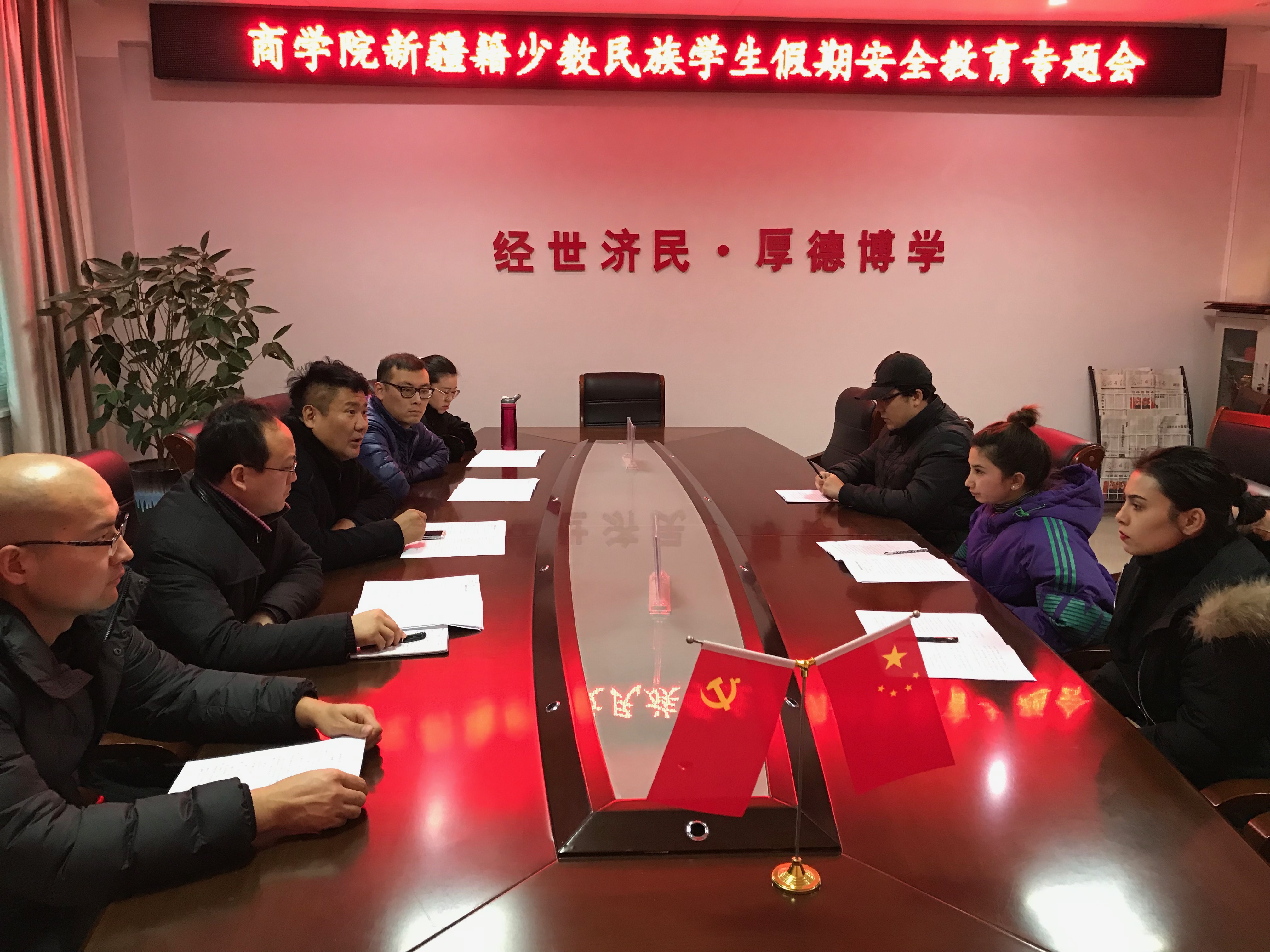 为了加强新疆籍少数民族学生教育管理,进一步增强学生法制观念,提高学生安全防范意识和能力,确保学生过一个安全祥和的寒假。学院于1月10日下午在506会议室召开新疆籍少数民族学生假期安全教育专题会议。新疆内派教师、学生处副处长苏和应邀出席了会议,我院党委副书记王永贵、专职辅导员、班主任及新疆籍少数民族学生共同参加了会议。
