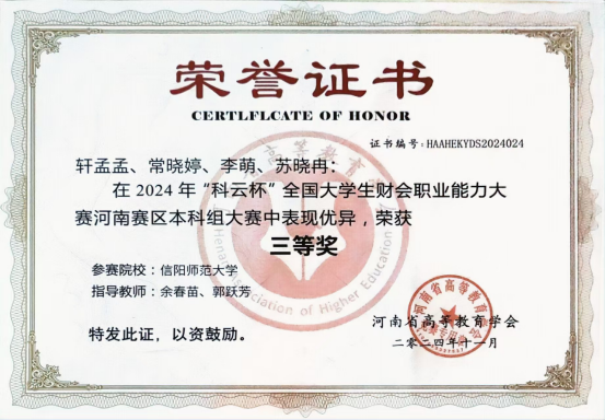 近日,在2024年“科云杯”全国大学生财会职业能力大赛河南赛区竞赛中,ok138cn太阳集团529余春苗、郭跃芳老师指导的参赛团队荣获河南省赛区三等奖。