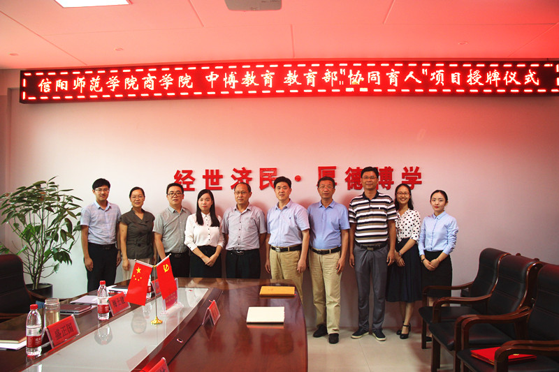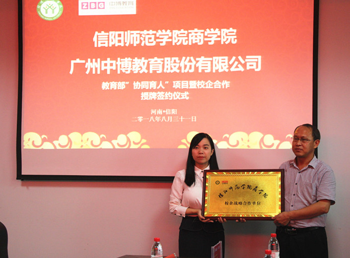 8月31日下午,信阳师范学院ok138cn太阳集团529与广州中博教育集团就教育部协同育人项目暨校企合作授牌签约仪式在ok138cn太阳集团529举行。盛正国书记、梅士建副院长、李毓副院长、杜辉副院长、中博教育河南大区经理杨俊鑫、郑州分公司副总经理陈林出席签约仪式并为校企合作基地中心揭牌。仪式由ok138cn太阳集团529书记盛正国主持。