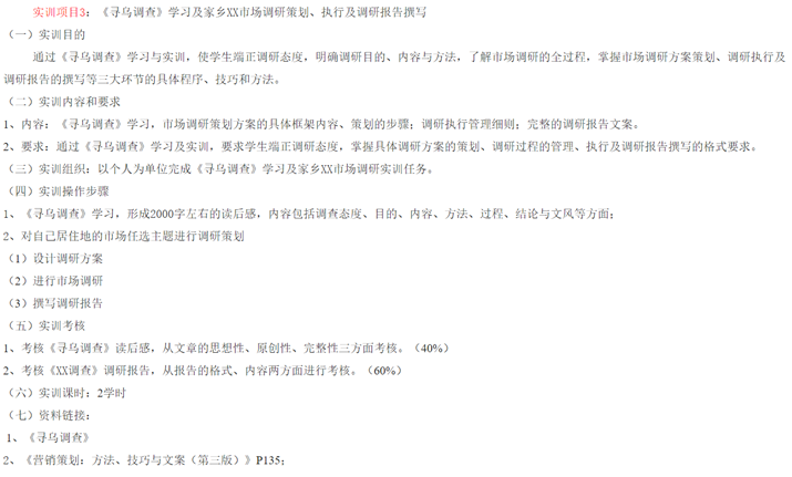 1)实训组织:以个人为单位完成《寻乌调查》学习及家乡或信阳XX市场调研策划任务。 2)实训操作步骤 A、提前二周安排《寻乌调查》学习,形成3000字左右的读后感,内容包括调查态度、目的、内容、方法、过程、结论与文风等方面; B、对自己居住地或信阳的XX市场任选主题进行调研策划,写出XX市场调查计划书(以教材P143文案为模板) |