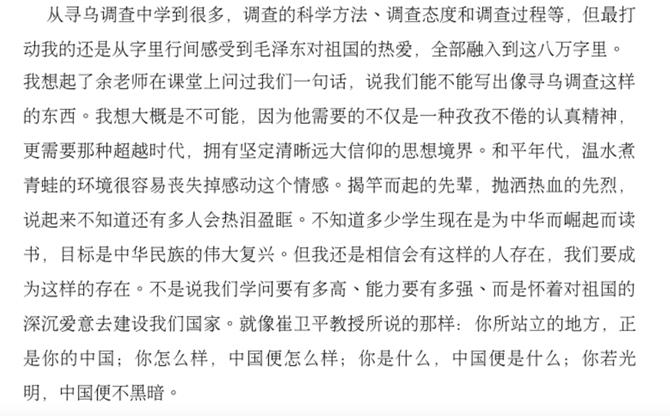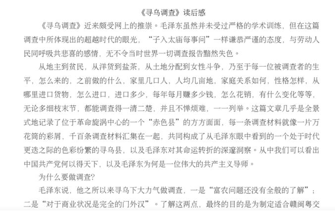 《寻乌调查》学习是绝大多数学生第一次阅读红色经典原著,从最初本能的拒绝、抵触,到为完成学习任务不得不被动学习,到开始阅读之后的沉浸其中,被毛主席认真细致的调研态度所折服,被其中丰富的内容、魅力的语言所吸引,为其中揭示出的剥削之残酷、无产阶级受压迫之深重而震惊,对调查得出的结论就有了更为深刻的认同,对党和人民的伟大斗争有了更好的理解!